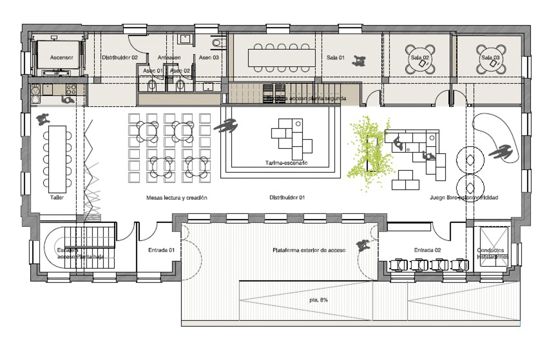 La propuesta integra un área multiusos donde impartir talleres, actuaciones, área de lectura y creación, espacio para la psicomotricidad infantil, salas varias y una biblioteca.