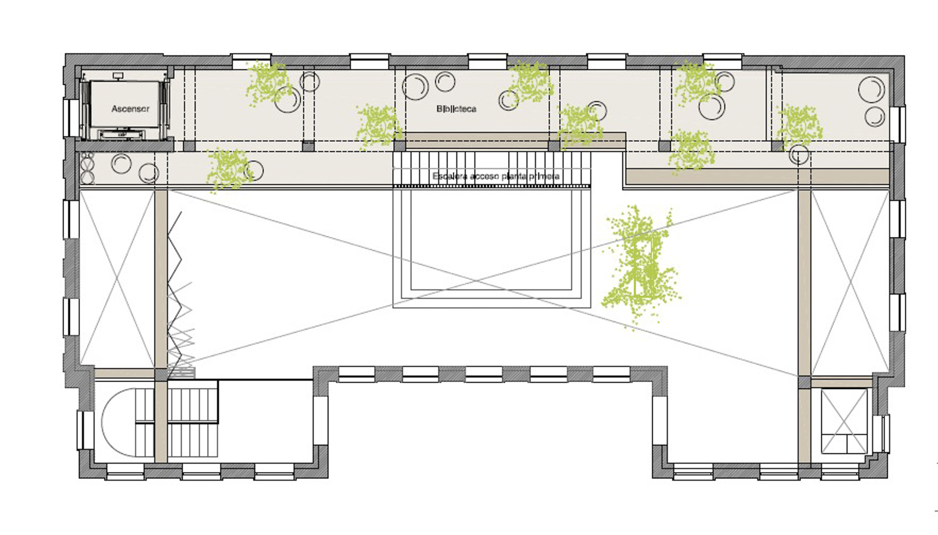 Se hace una rehabilitación integral del edificio transformando su interior, pero respetando la volumetría y distribución tan característica y valiosa del volumen principal. Ahora se disfruta de un espacio diáfano con doble altura.