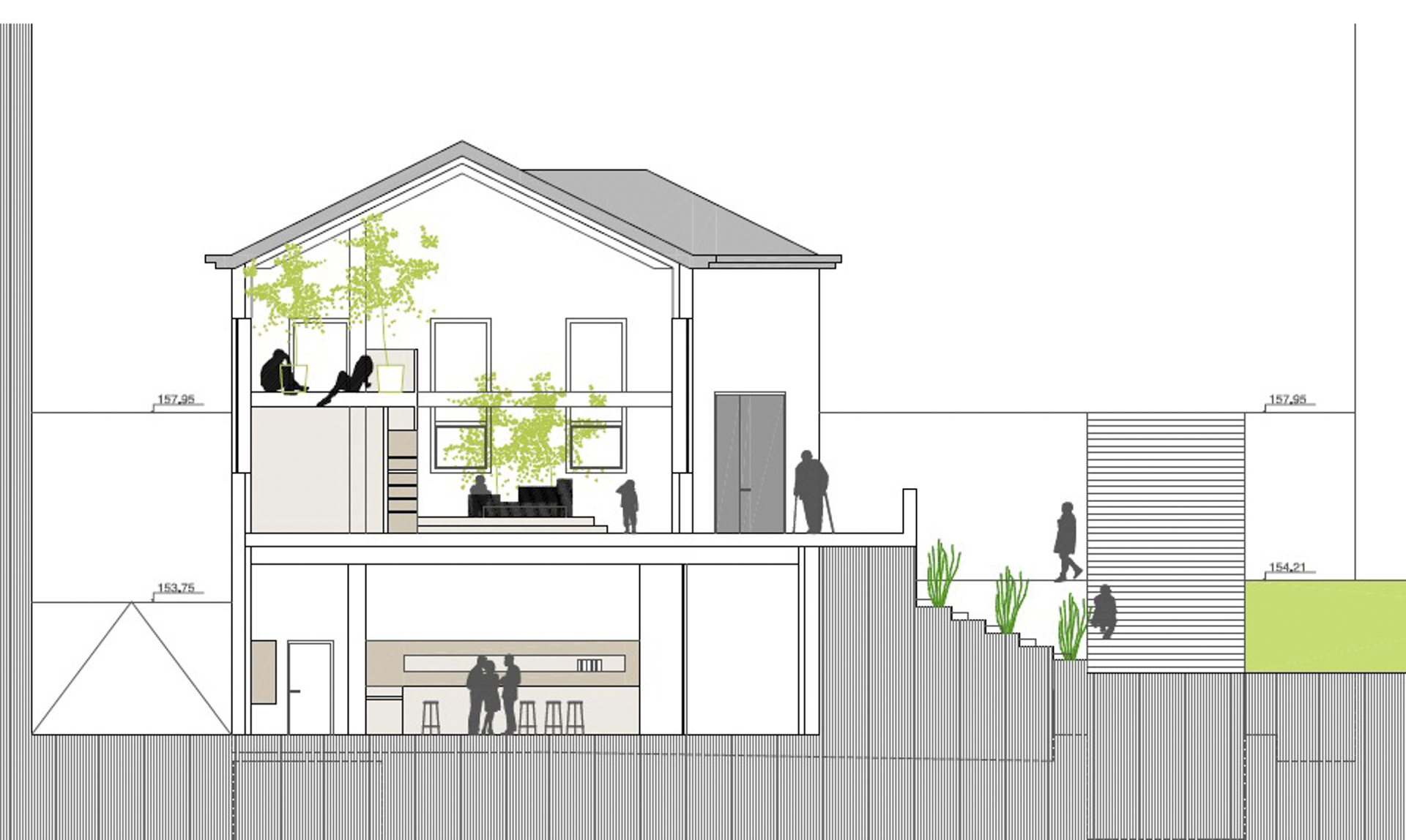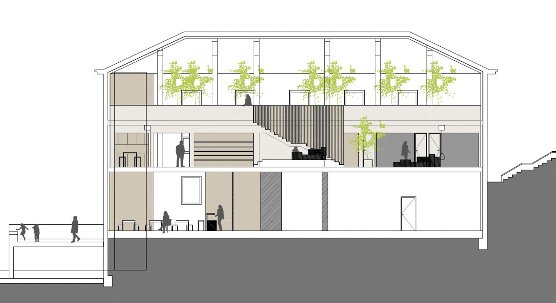 La cafetería, en la plata semisótano, se relaciona directamente con la placita y el espacio exterior (que también se modifica en proyecto) para garantizar la accesibilidad de todas las personas de la ciudad.
