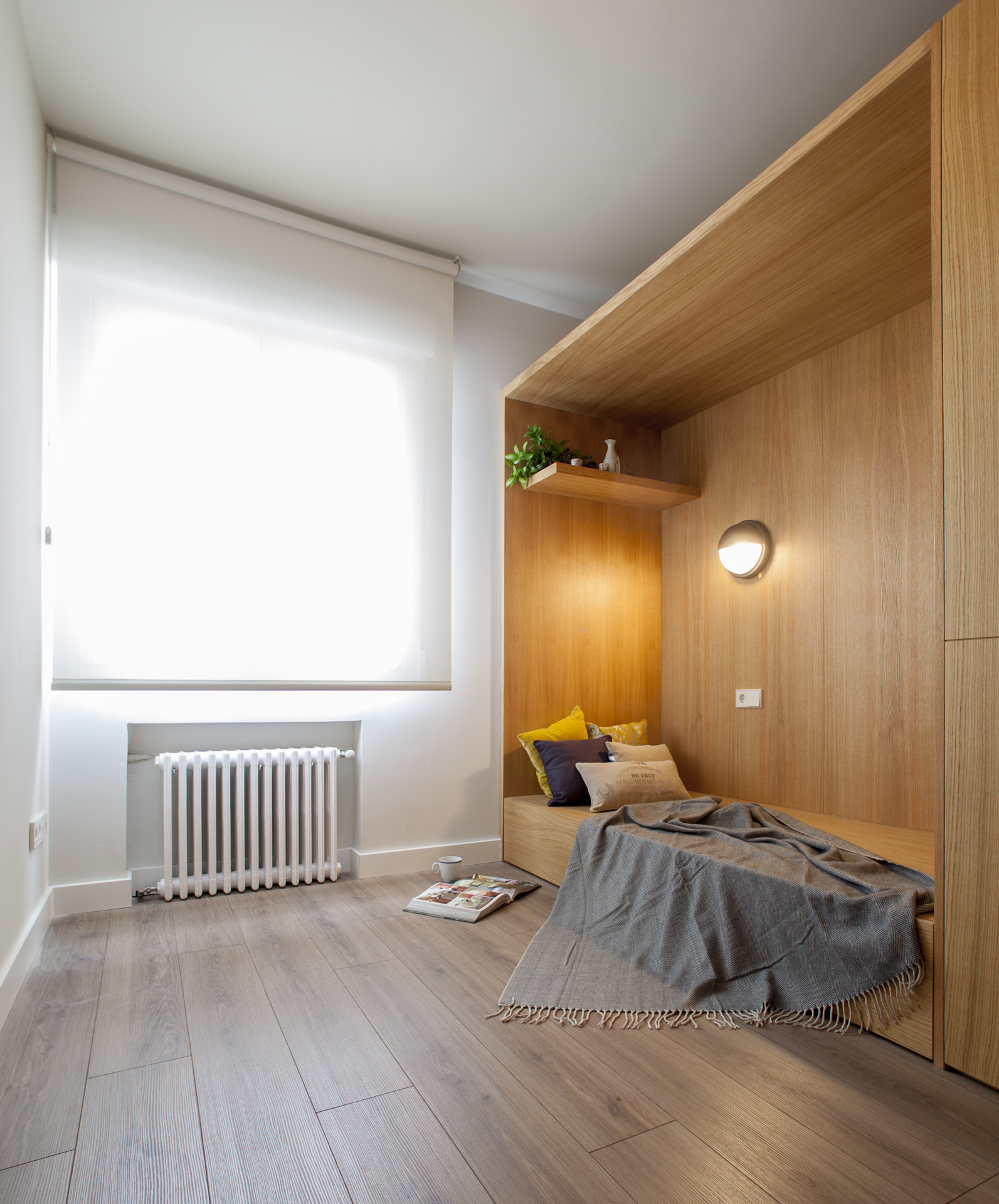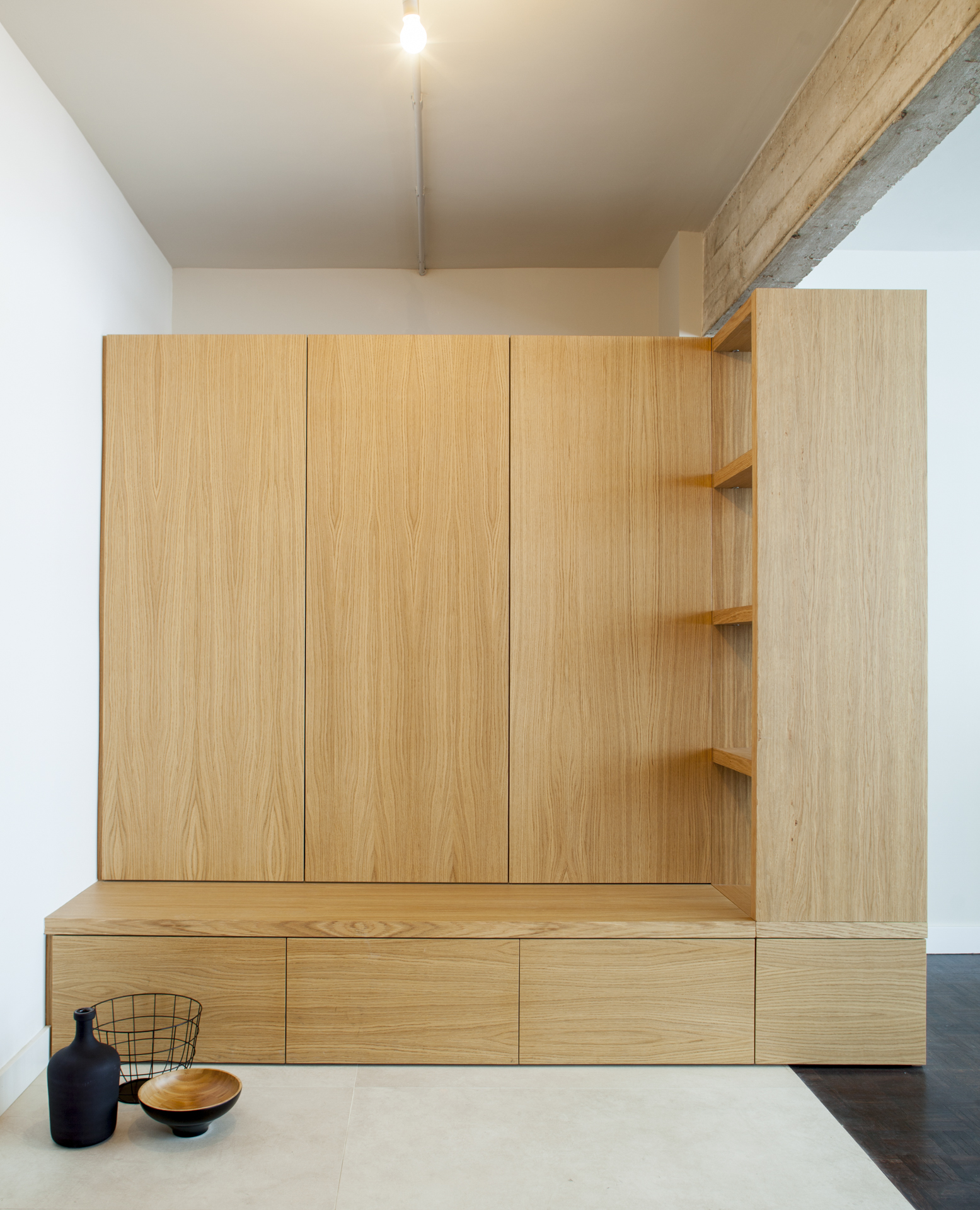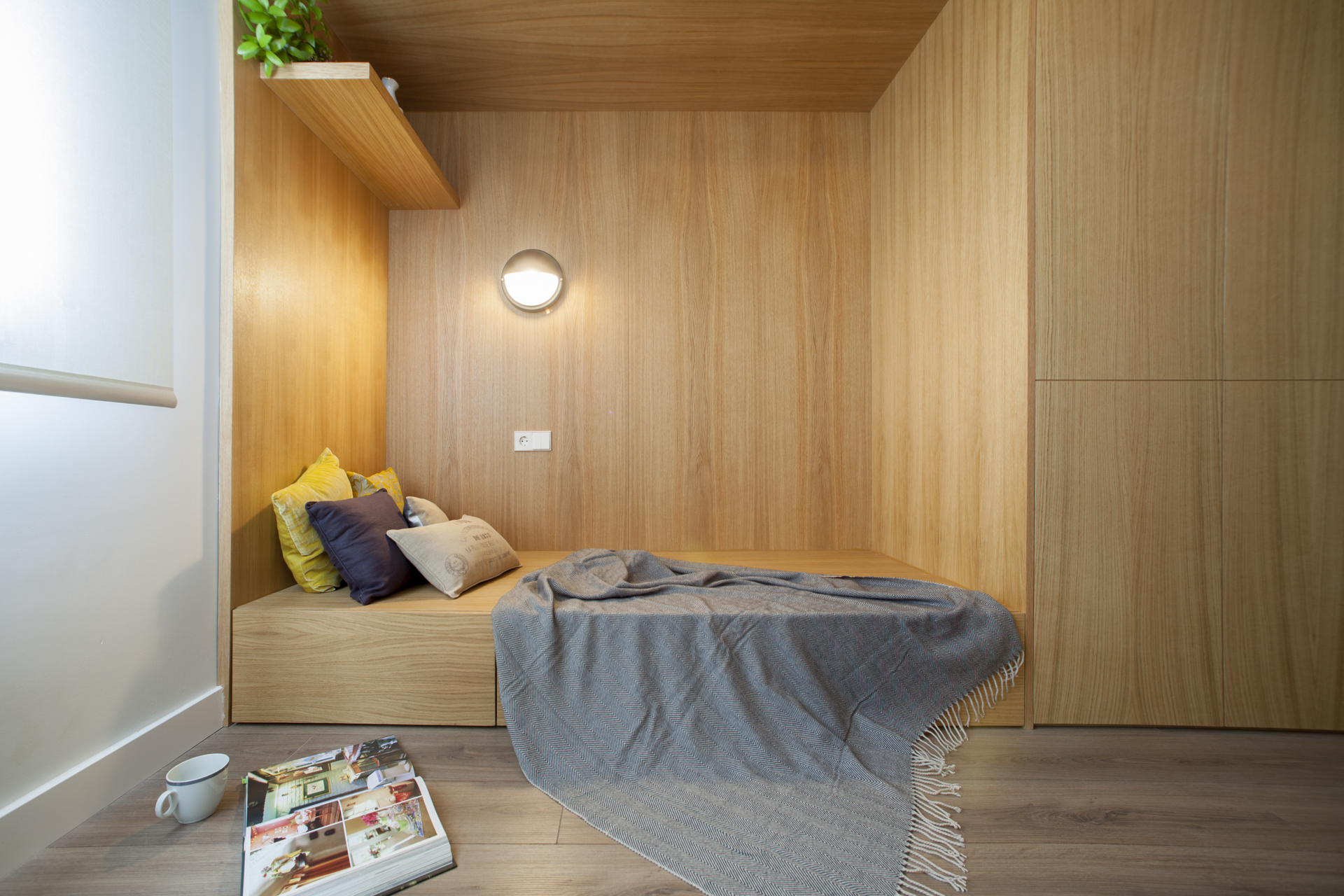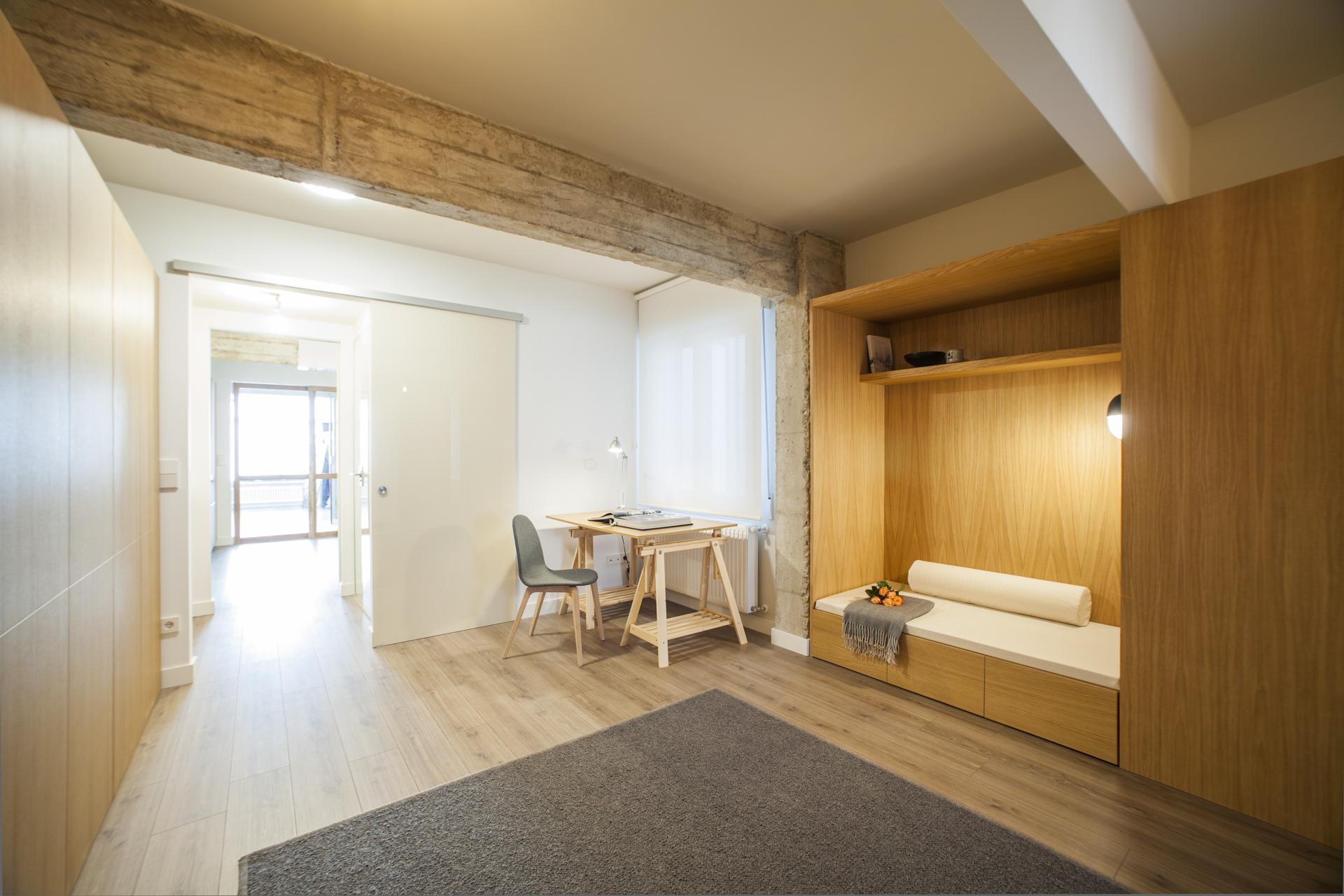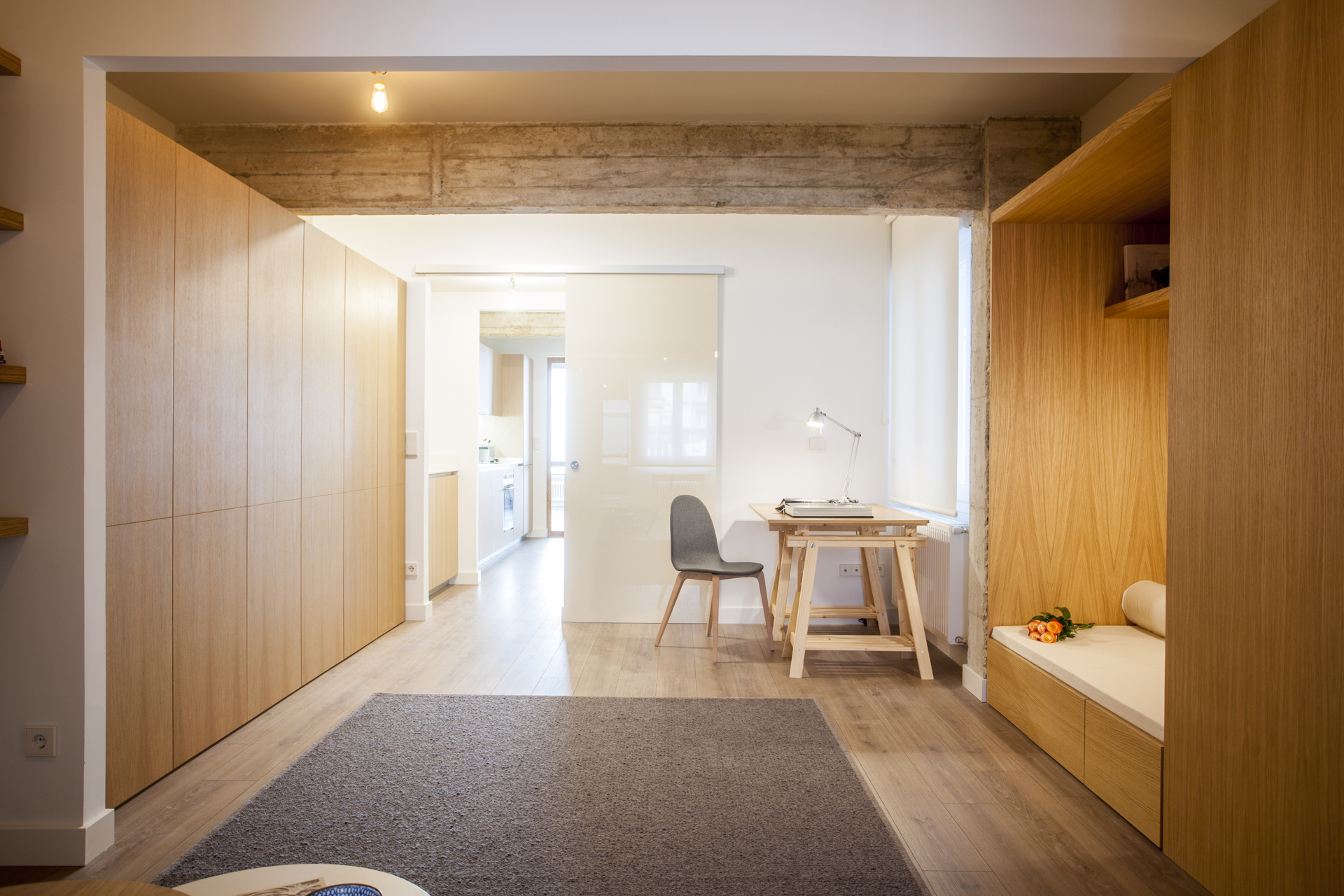 Mueble corrido que se adapta en forma y diseño según el espacio, pudiendo ser un gran banco-contenedor en la entrada, un mueble de cocina o lavabo, un armario ropero, una estantería o un rincón de lectura y descanso.