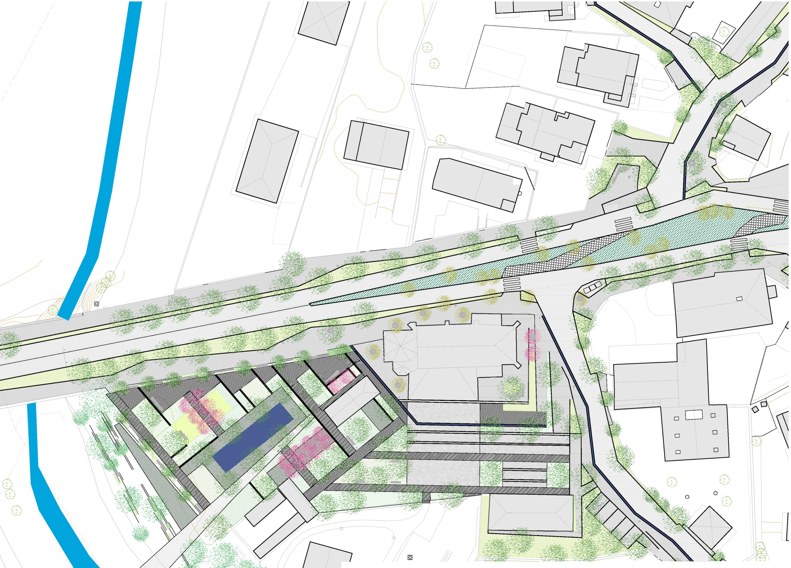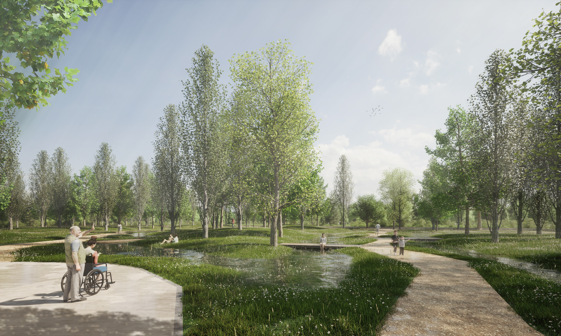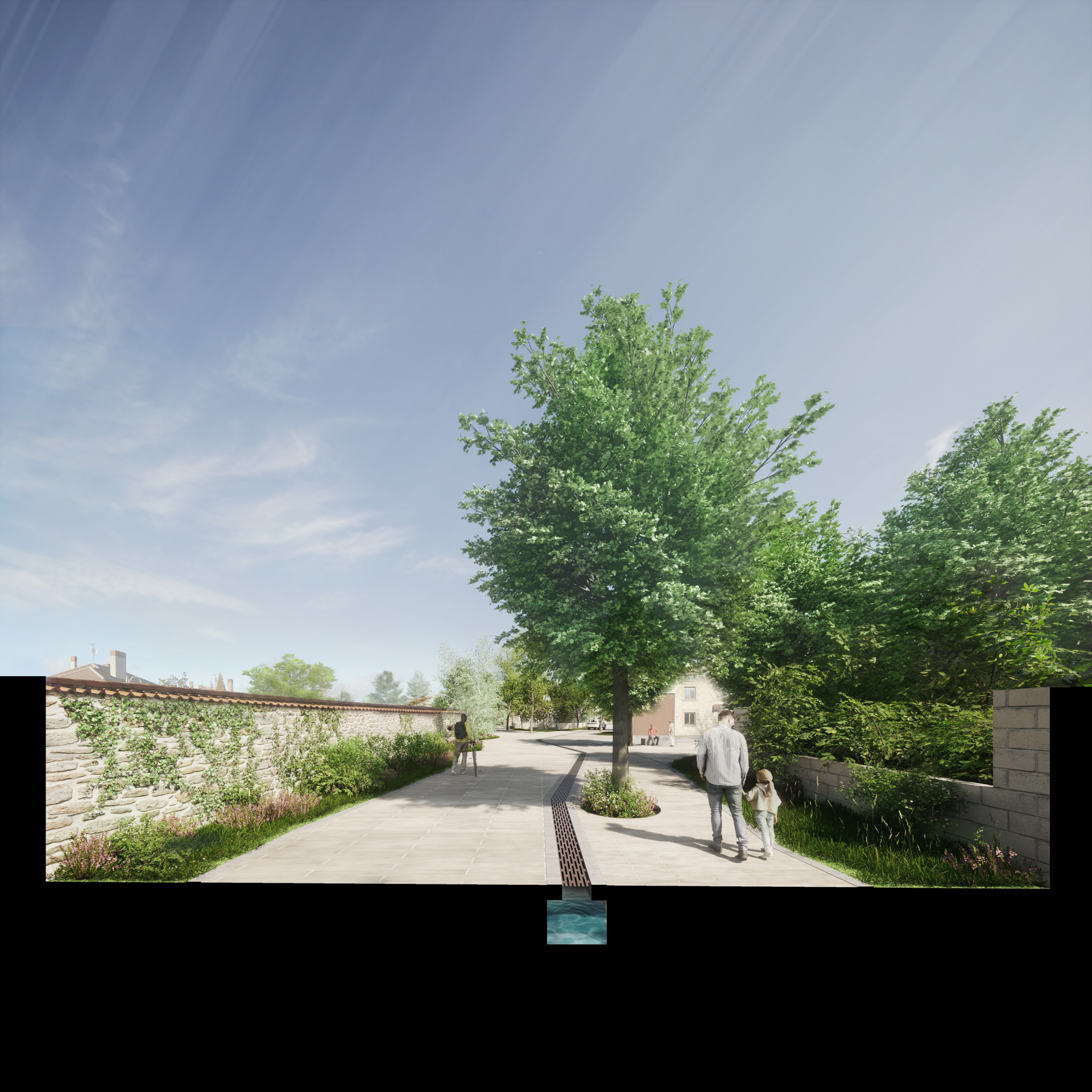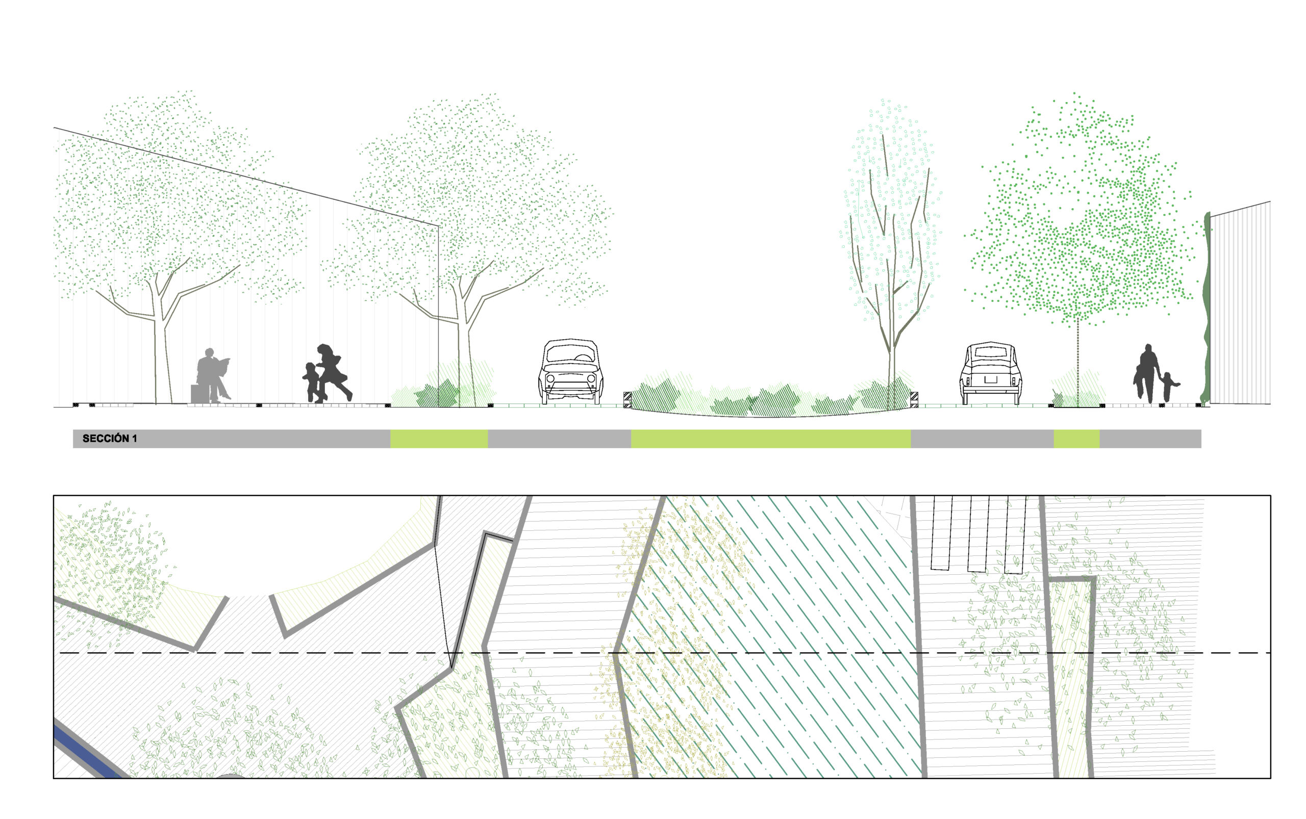 Nueva sección de las calles, urbanizándolas al mismo nivel, desdibujando las convencionales alineaciones de arbolado, e incorporando mucha vegetación y presencia del agua.